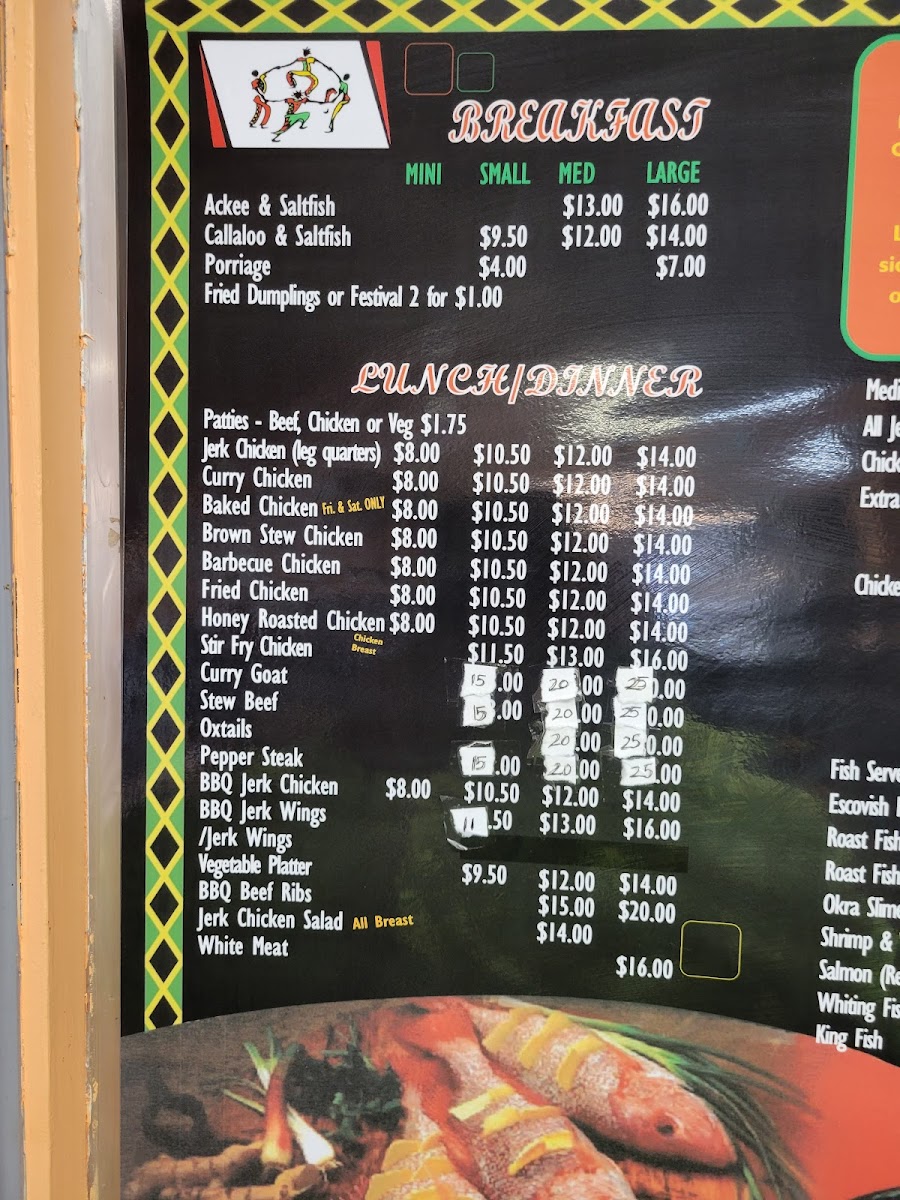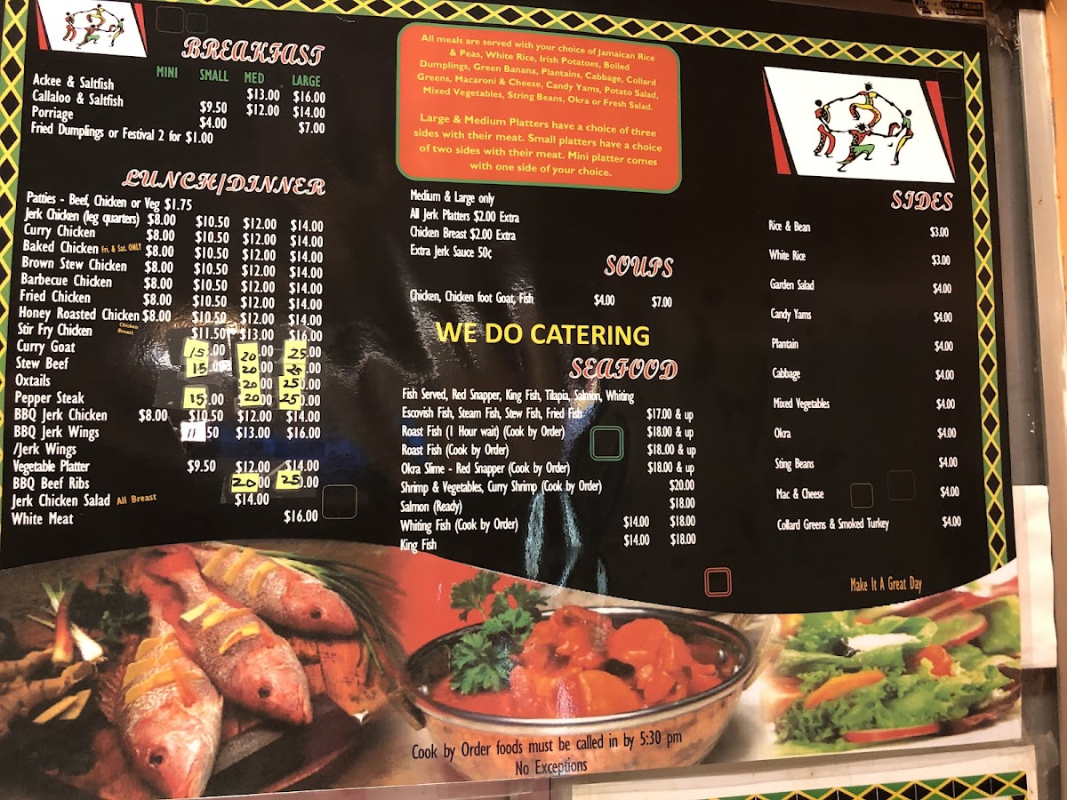 For breakfast, start your day with the iconic Ackee & Saltfish or the flavorful Callaloo & Saltfish, both crafted to perfection. Seafood lovers can savor dishes like the Escovish Fish and the freshly-prepared Roast Fish—each offering a taste of the sea that’s hard to resist.